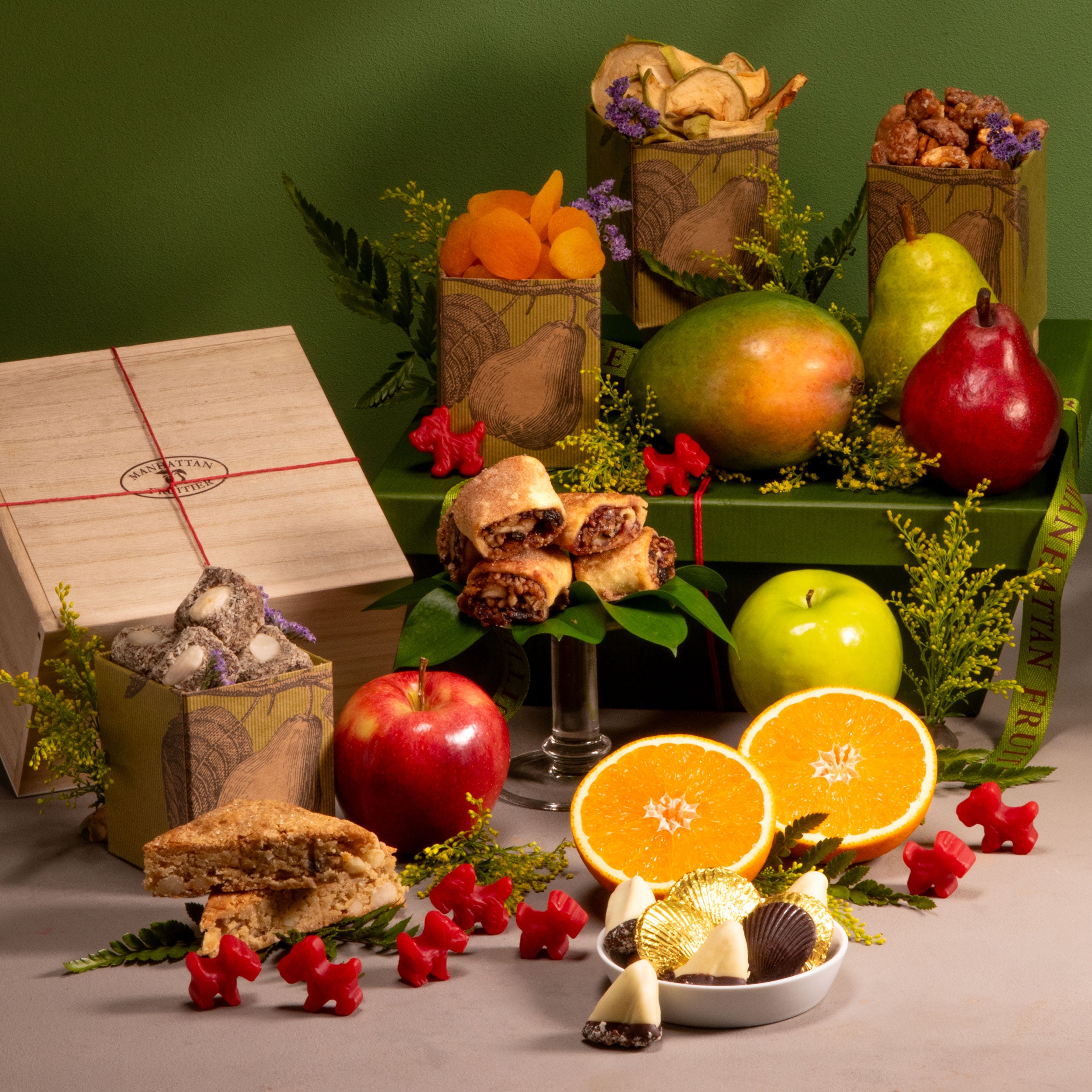 To this generous assortment, we add two beloved New York indulgences: buttery rugelach from Erica’s Bakery, made in small batches for a tender, flaky bite, and Red Licorice Scottie Dogs, a nostalgic treat that adds a playful touch to this elegant gift.
