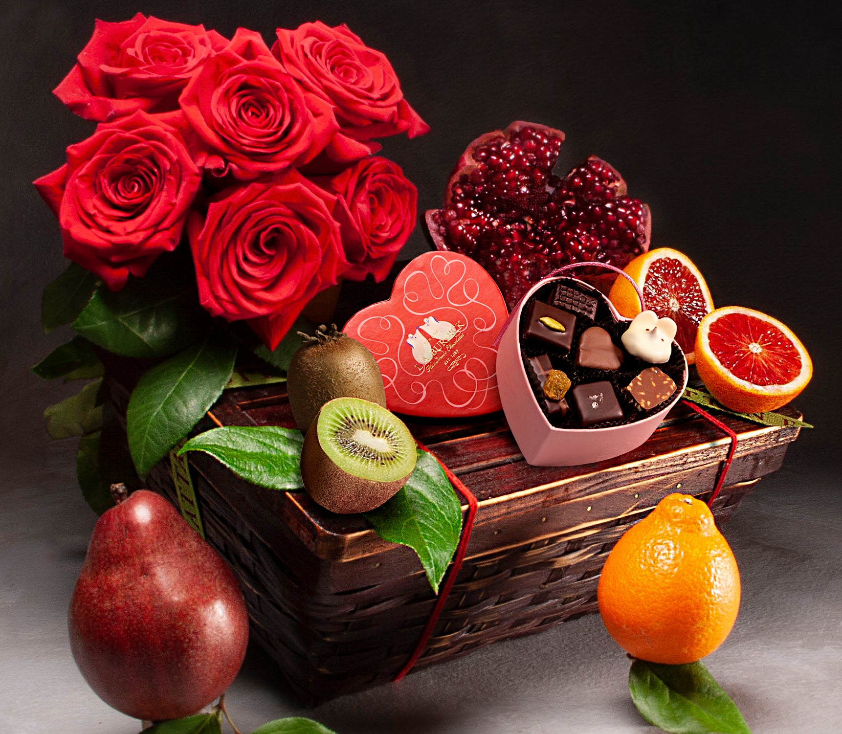 Can't decide between fruit roses and sweets? We've got the answer! Three Part Harmony - Tenor combines all three in a single beautifully composed gift that is truly a medley of the senses. The Tenor features a 4lb fresh fruit hamper 6 romantic red roses straight from the NYC flower market and a delightful heart-shaped Valentine heart box of LA Burdick artisan chocolate assortment, including their beloved chocolate mouse, each piece made individually by hand.