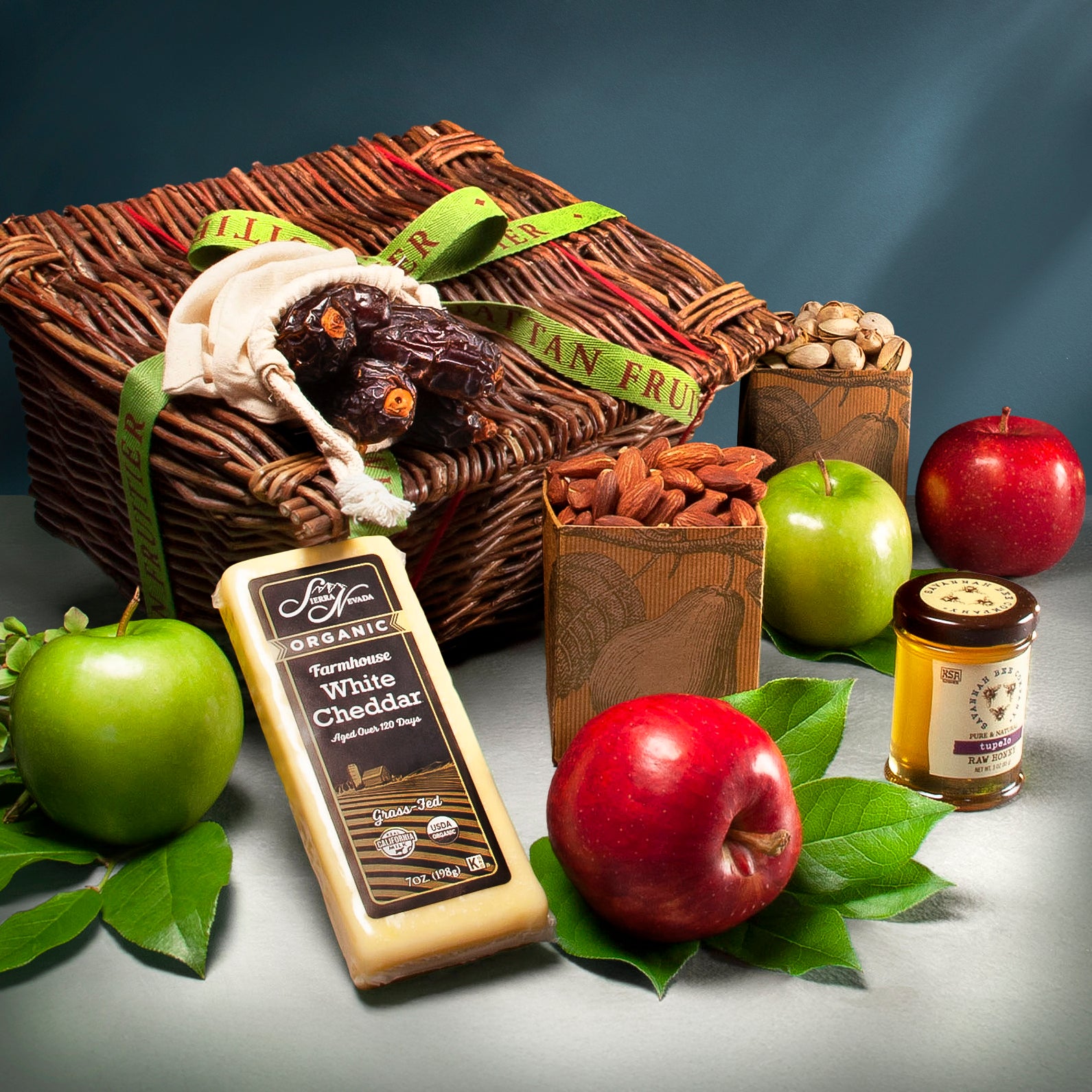 An appletizer spread to celebrate any holiday or occasions is delightfully easy with this basket of savory, nutty snack treats, kosher cheese, and apples of course! Fresh-picked apples pair beautifully with certified Kosher Grass-fed White Cheddar from Sierra Nevada Cheese Co. Drizzle a slice with raw wildflower honey from Catskill Provisions in NY and follow with fresh roasted, salted almonds and dates, and whole Organic and Kosher pistachios in shell.