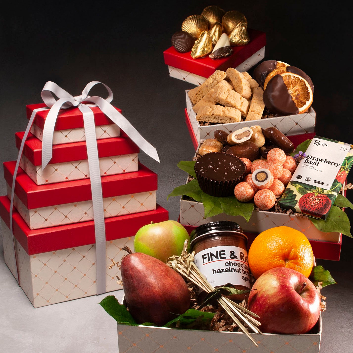Elevate your gifting with The Confection Tower, a multi-tiered presentation of fruit and confections curated to impress. This luxury chocolate and sweets gift tower features seasonal fresh fruit, indulgent Fine & Raw hazelnut sauce, a Raaka seasonal organic chocolate bar, our house-made dark chocolate peanut butter cup, and Harbor Sweets Sloops & Shells. To complete the experience, enjoy crisp lemon almond biscotti and other artisanal delights, beautifully stacked for a dramatic presentation. A true standout for corporate gifting, holiday celebrations, and milestone moments.