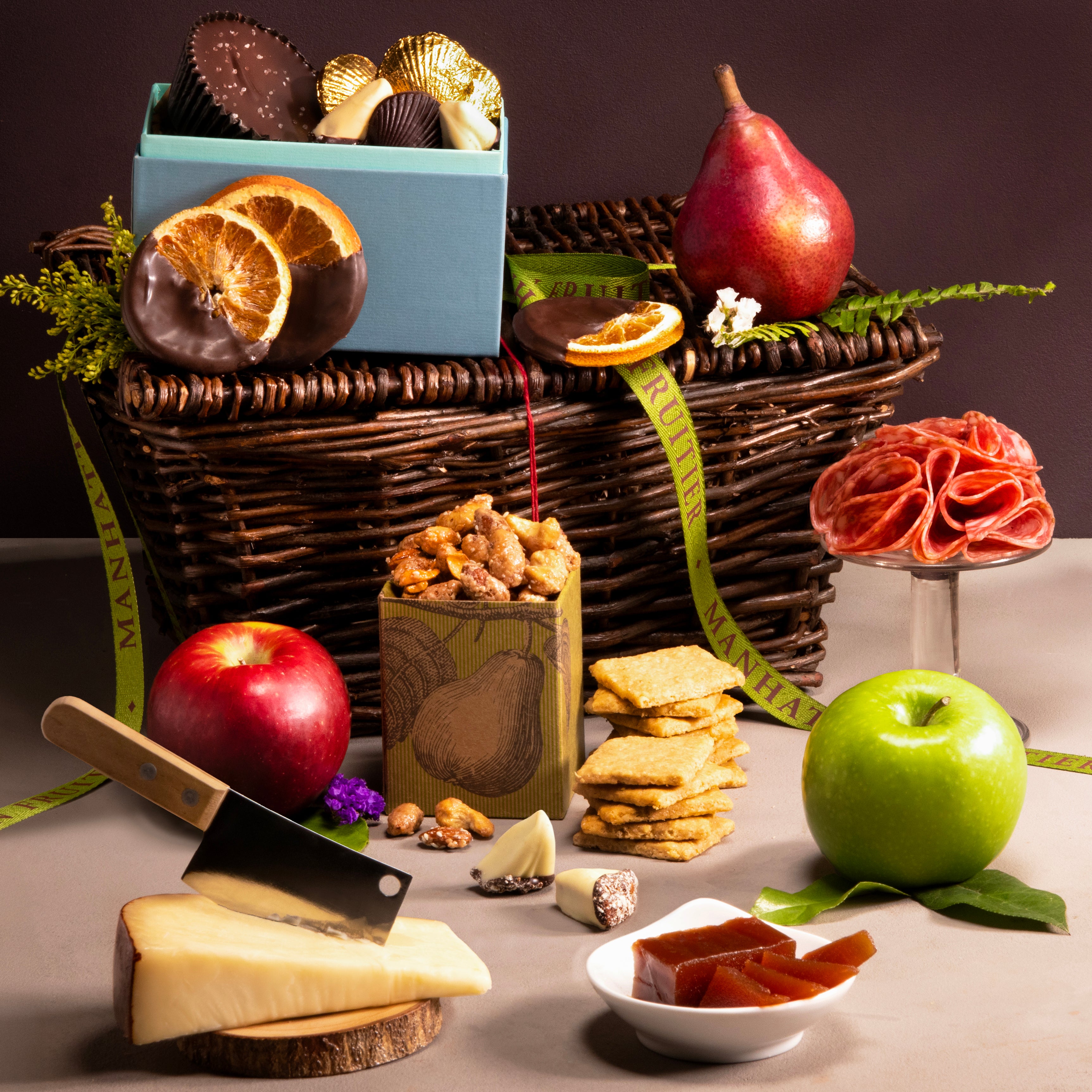 Everyone deserves a little indulgence now and then. The Bon Vivant is a refined luxury gourmet gift basket that celebrates the art of good taste. This elegant collection features an assortment of artisan cheeses, cured meats, fresh seasonal fruit, and decadent chocolates, beautifully arranged to create an effortless feast for the senses. Perfect for corporate gifting, client appreciation, or celebratory occasions, the Bon Vivant brings together savory sophistication and sweet indulgence in true Manhattan Fruitier style.