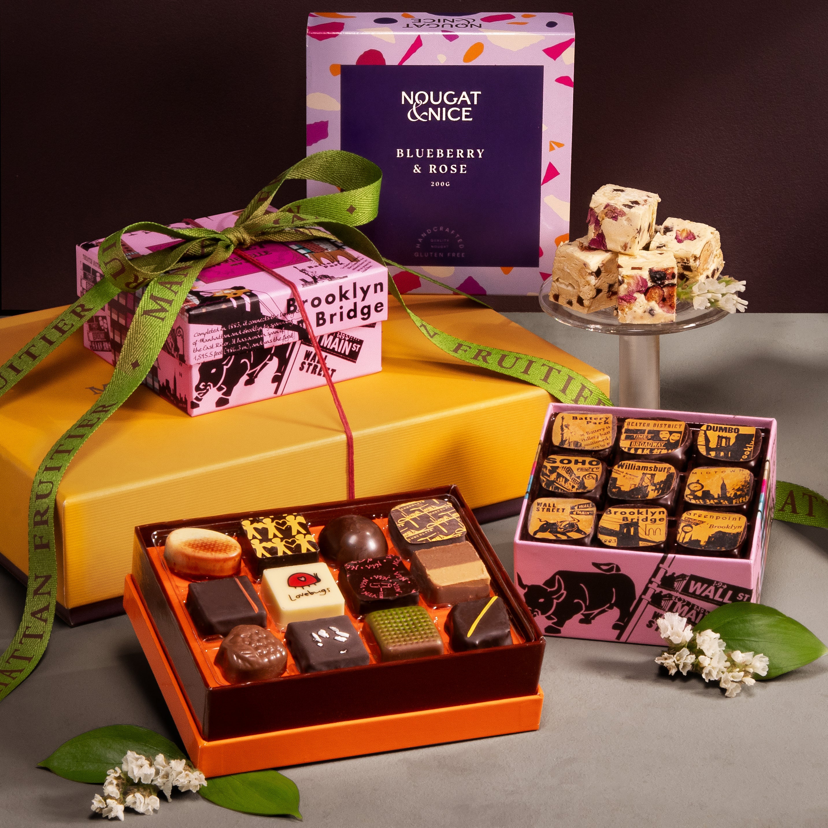 Say mais oui to decadence. Our French-inspired dessert basket assembles a trio of artisanal confections: blueberry & rose nougat handcrafted by Nougat & Nice (Australia), chocolate bon bons from Jacques Torres, and an NYC Chocolate Caramel Box by MarieBelle that opens to reveal nine pieces of creamy dark chocolate covered caramels. The MarieBelle assortment is accented with all-natural flavors—including Fleur de Sel, Italian Espresso, and Chocolate Caramel—and finished with charming designs of New York and Brooklyn landmarks. Elegant, indulgent, and impeccably curated, Mais Oui is a luxury confection gift basket for the most discerning sweet-tooth and a standout choice for birthdays, thank-yous, and corporate gifting.